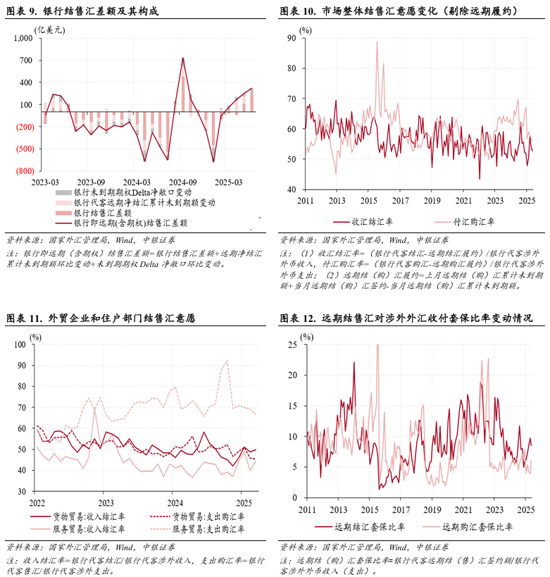 6月份,银行结售汇连续第四个月出现顺差,且顺差规模逐月扩大。5、6月份,市场即期结汇意愿和购汇动机齐降,且购汇动机相对稳定,反映出市场对人民币汇率预期继续分化,逢低购汇需求相对旺盛。