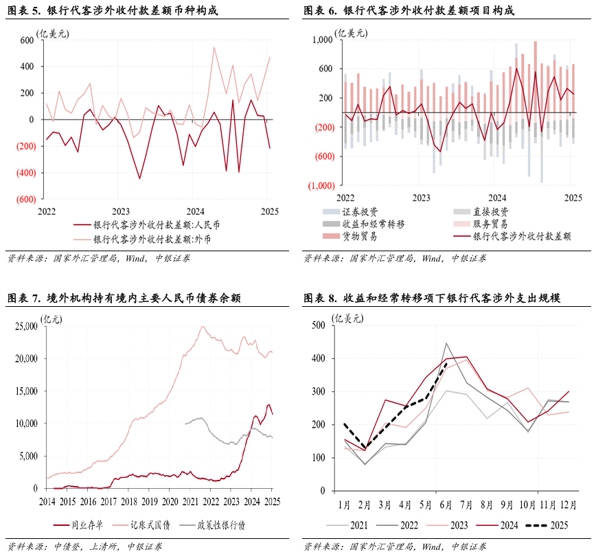6月份,收益和经常转移逆差连续第四个月扩大至269亿美元,其中涉外支出环比增加104亿至383亿美元,历史同期排名第三,反映了分红派息的季节性因素影响(见图表8);得益于我国外贸出口韧性较强,货物贸易涉外收付款顺差环比增加76亿至668亿美元,历史排名第六,并且创历史同期新高,继续发挥跨境资金流动的稳定器作用;服务贸易逆差连续第五个月收窄至81亿美元,为2023年7月以来新低,其中涉外支出规模为379亿美元,为历史同期第三,仅低于2017年和2024年同期支出规模385亿和387亿美元,反映居民跨境出境需求仍然旺盛;直接投资逆差连续第二个月收窄至27亿美元,为去年11月份以来新低,其中涉外收入和支出规模表现较为平稳,环比分别增加84亿和74亿美元。