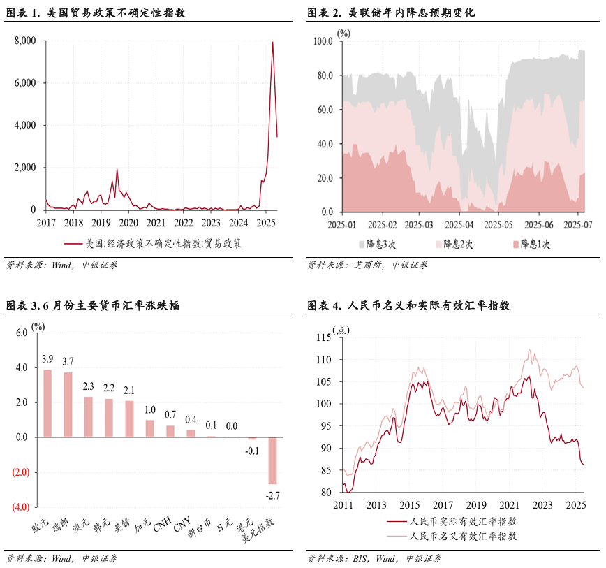 6月份,美国贸易政策不确定性继续缓和,中美经贸磋商取得新进展。伴随着美联储降息预期升温,美元指数继续下跌且跌幅有所扩大,人民币双边汇率保持渐进升值,多边汇率继续走弱。这虽然有助于增强我国出口产品竞争力,但同时也要警惕国际社会对我国货币问题的关注甚至炒作。